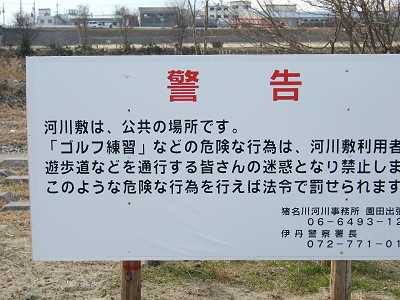 桑津橋の南側の河川敷内は、野球グラウンド、北側はサッカー用のグラウンドとして、伊丹市が整備しているのですが、そのサッカー用のグラウンドを北に外れた辺りでは、ゴルファーを目にすることが多いです。 ここにも、「河川敷内でのゴルフ禁止」の常設看板がところどころに設置されているのですが、遊歩道と土手の間で、距離の目安になるコーンを置いて、何人もが打ちっぱなし練習をしているのが目に付きます。 ここにも、こんな「警告」看板が新しく何本も立てられました。