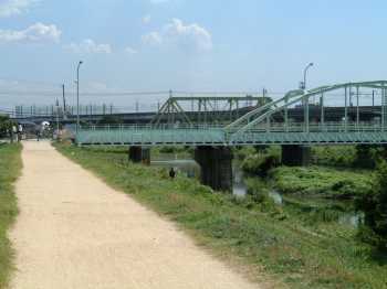 宮園橋で河川敷内に下り、阪急電鉄の鉄橋をくぐり、再び土手道に戻る。