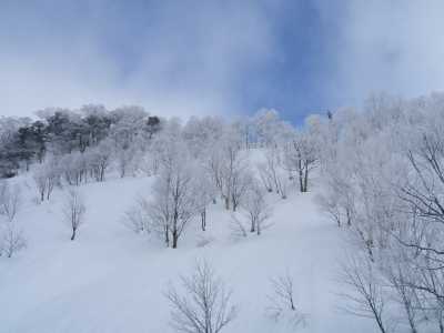 午前中、ガスの切れ間に姿を見せた「白馬乗鞍岳」を、栂の森ゲレンデの最上部から眺めることができました。この日は、これより南の稜線、白馬三山などは雲に隠れて、その姿を望むことは出来ませんでした。